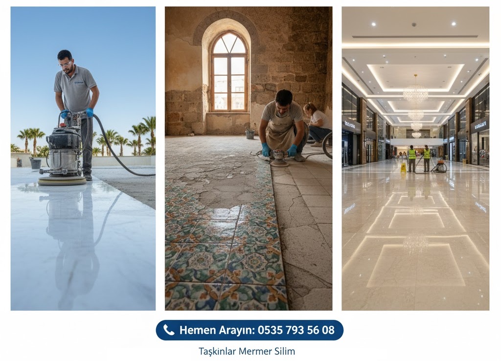 Taşkınlar Mermer Silim, Antalya genelinde profesyonel mermer silim, çini ve mozaik parlatma, zemin yenileme hizmetleri sunmaktadır. 25 yılı aşkın deneyimimizle yüzlerce projede zeminlere yeniden hayat verdik. Amacımız yalnızca taş yüzeyleri parlatmak değil, kalıcı kaliteyle alanlarınıza estetik kazandırmaktır.