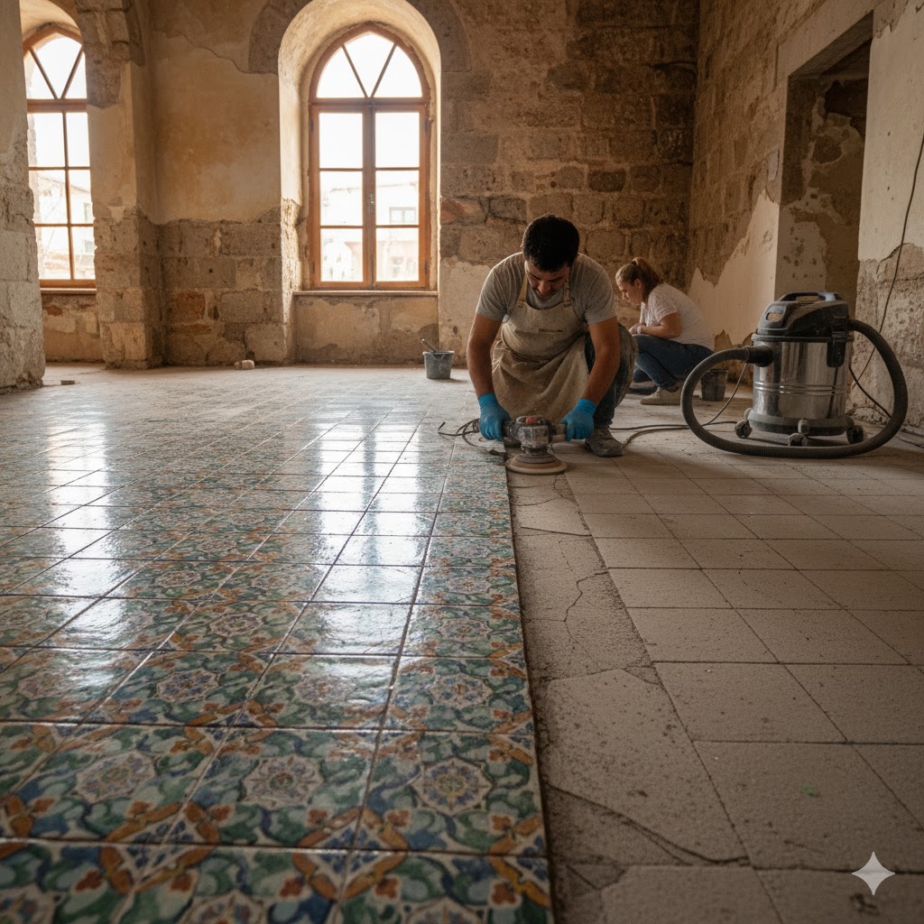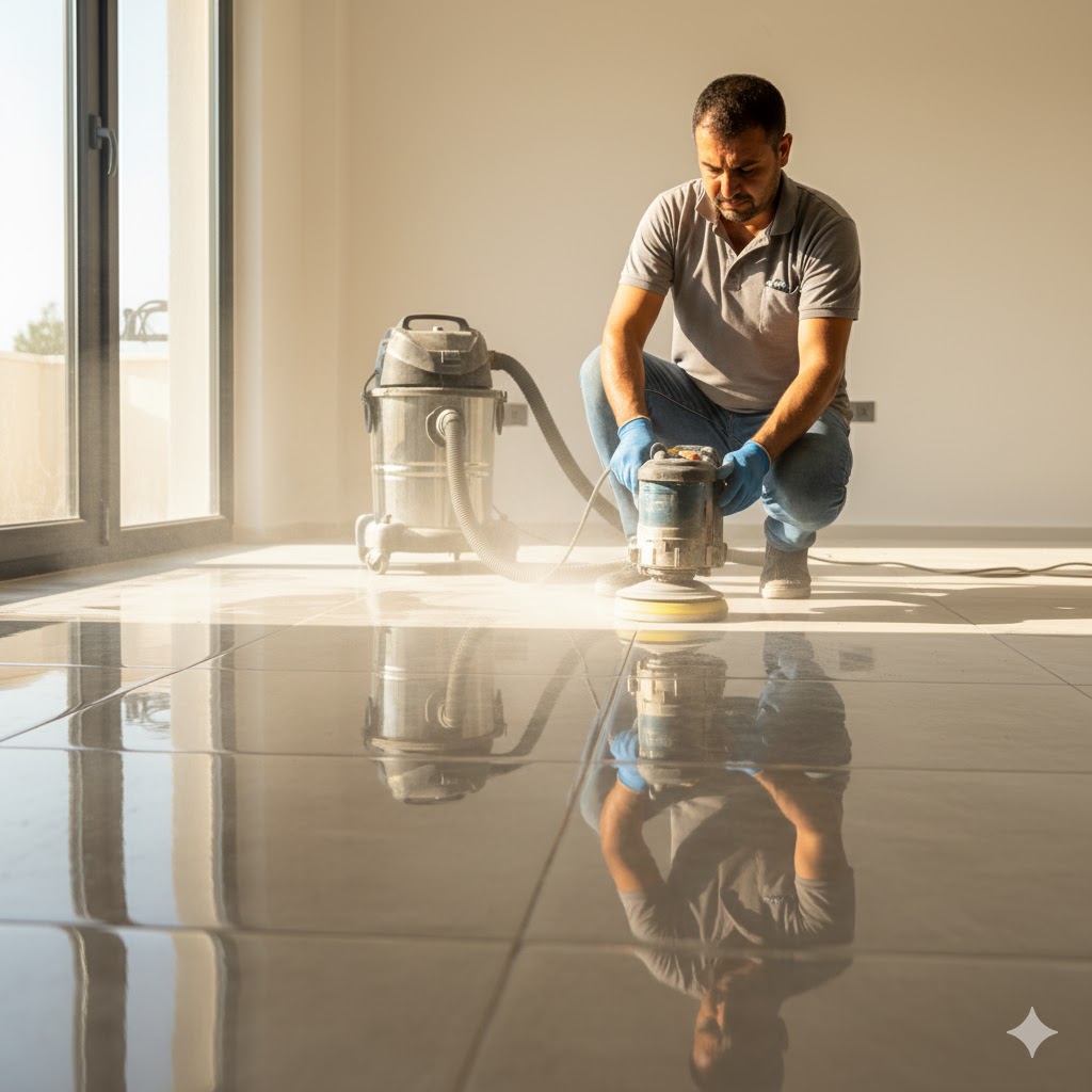 Konyaaltı bölgesindeki özel villa projesinde karo zeminlerde düzleştirme ve cilalama işlemleri uygulandı. Zemin...